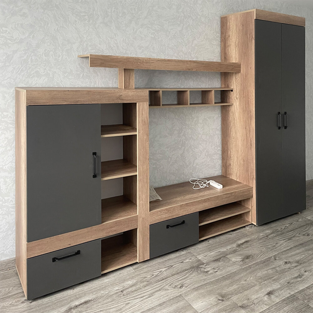 Новая модульная коллекция Прима в актуальном декоре дуб каньон/графит удачно впишется в современную обстановку Вашей квартиры и позволит организовать грамотное хранение вещей в гостиной и спальне. Приятный древесный оттенок корпуса гармонично дополнен матовым графитом, в котором исполнены фасады. Широкая тумба имеет место под телевизор размером 120х46 см и универсальную сборку.Максимальная нагрузка на полку - 10 кг.
