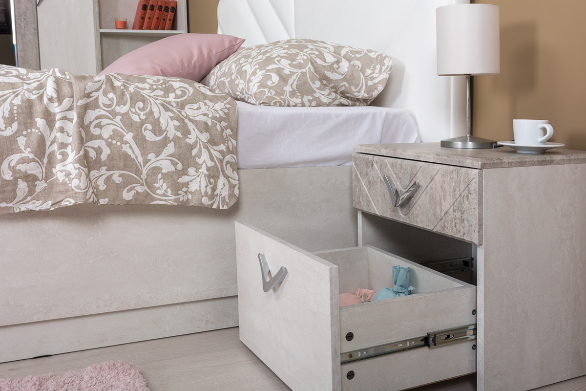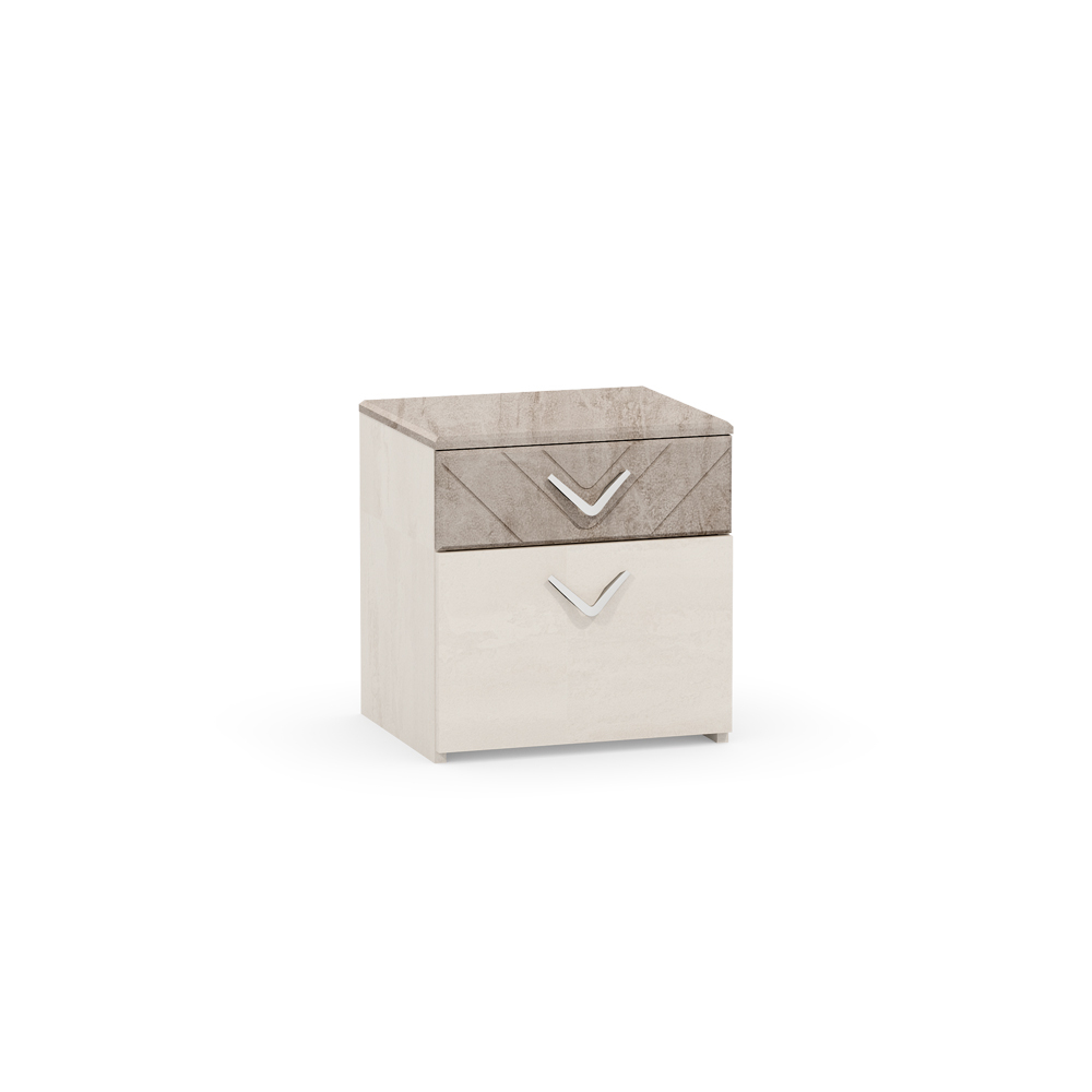 Прикроватная тумба «Амели» с фасадами «шёлковый камень» и корпусом «бетон Чикаго беж» сочетает в себе элегантность и практичность. Изготовлена из высококачественных материалов: ЛДСП и МДФ. Глянцевые фасады без фотопечати обеспечивают стильный вид, а наличие двух ящиков с шариковыми направляющими и удобными ручками делает тумбу функциональной.