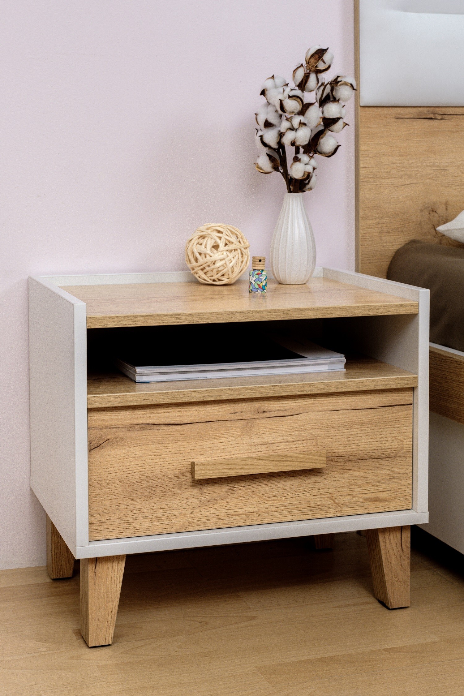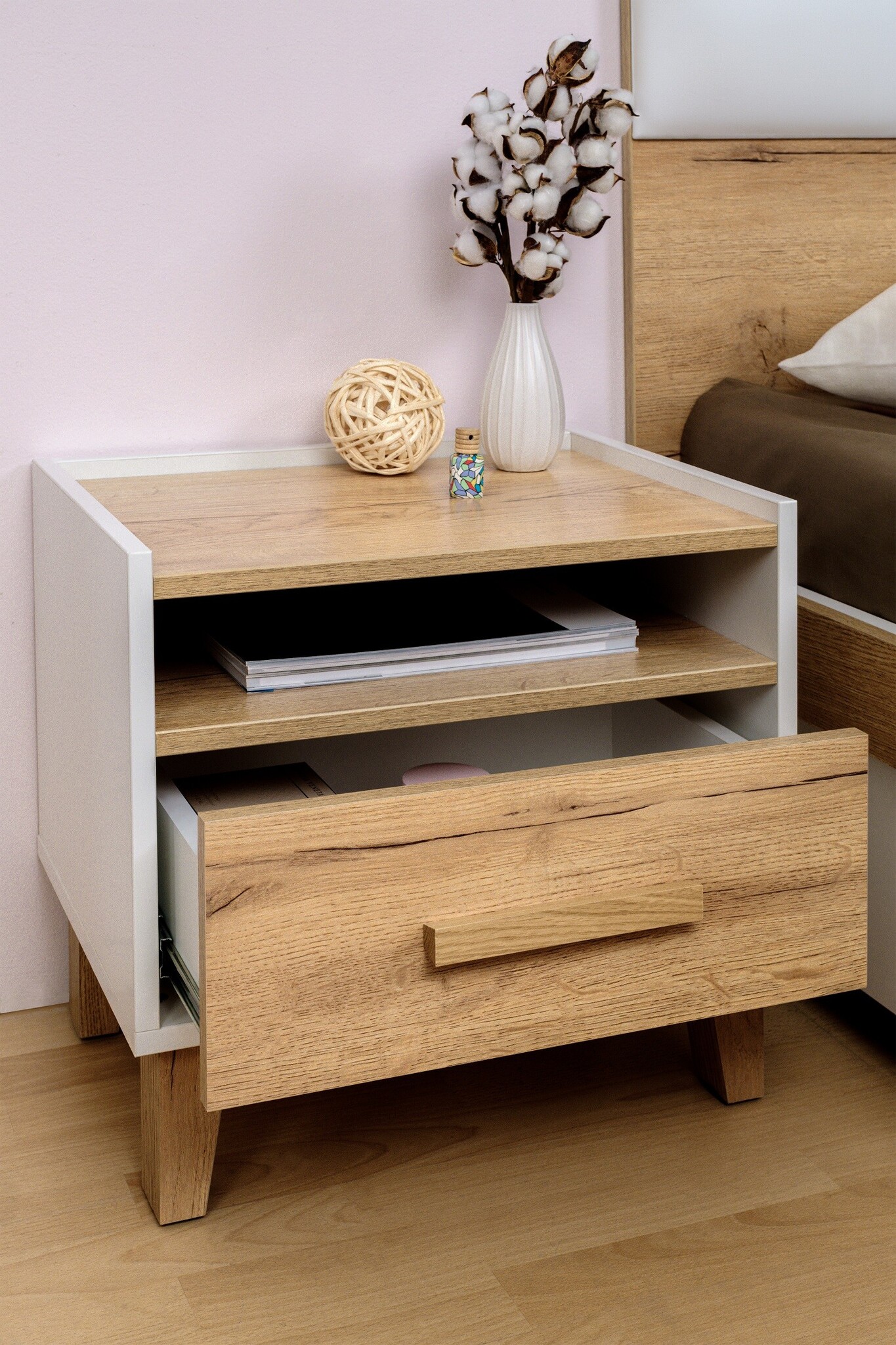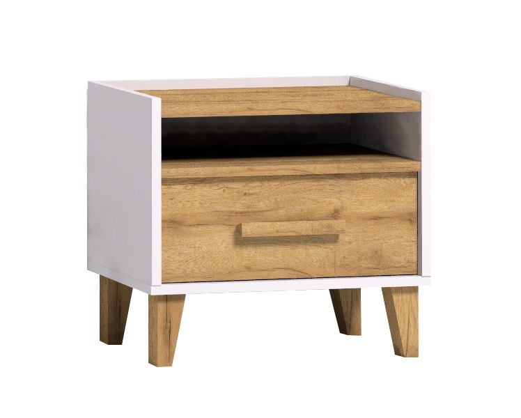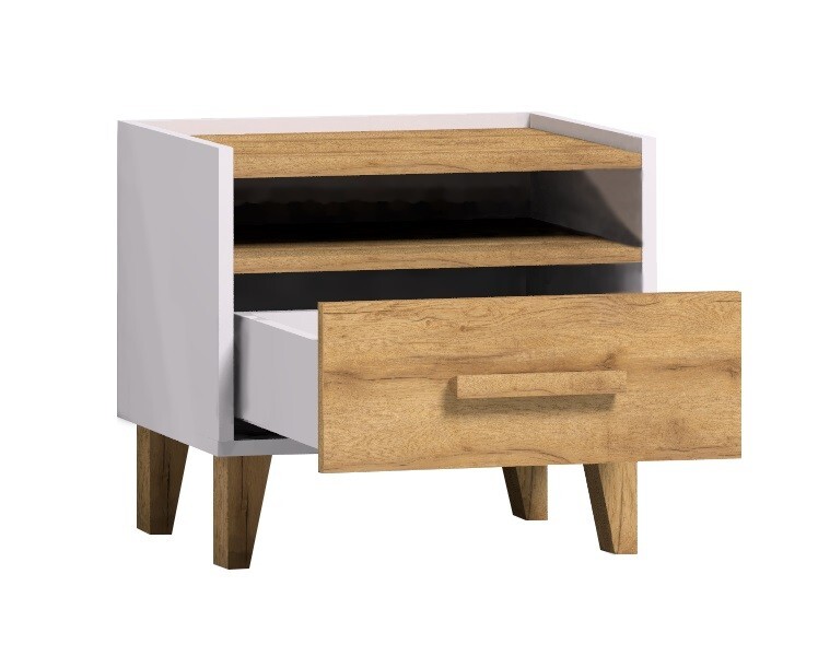 Прикроватная тумба гармонично дополняет мебельный гарнитур в спальне. В поисках тумбы в скандинавском стиле рекомендуем обратить внимание на Айрис. Модель на высоких ножках - это практичное место для хранения мелочей, которые необходимо иметь под рукой перед сном и с утра после пробуждения. Ручки из массива дерева выполнены в том же декоре, что полка, фасад ящика и ножки. Декор "дуб золотистый" имитирует текстуру натурального дерева и прекрасно сочетается с белым корпусом модуля.