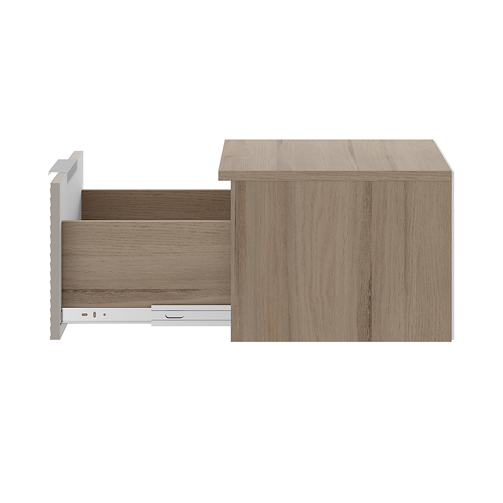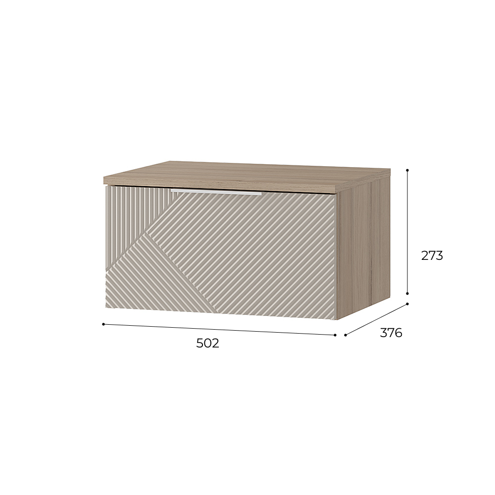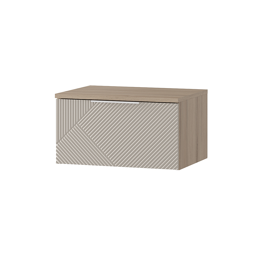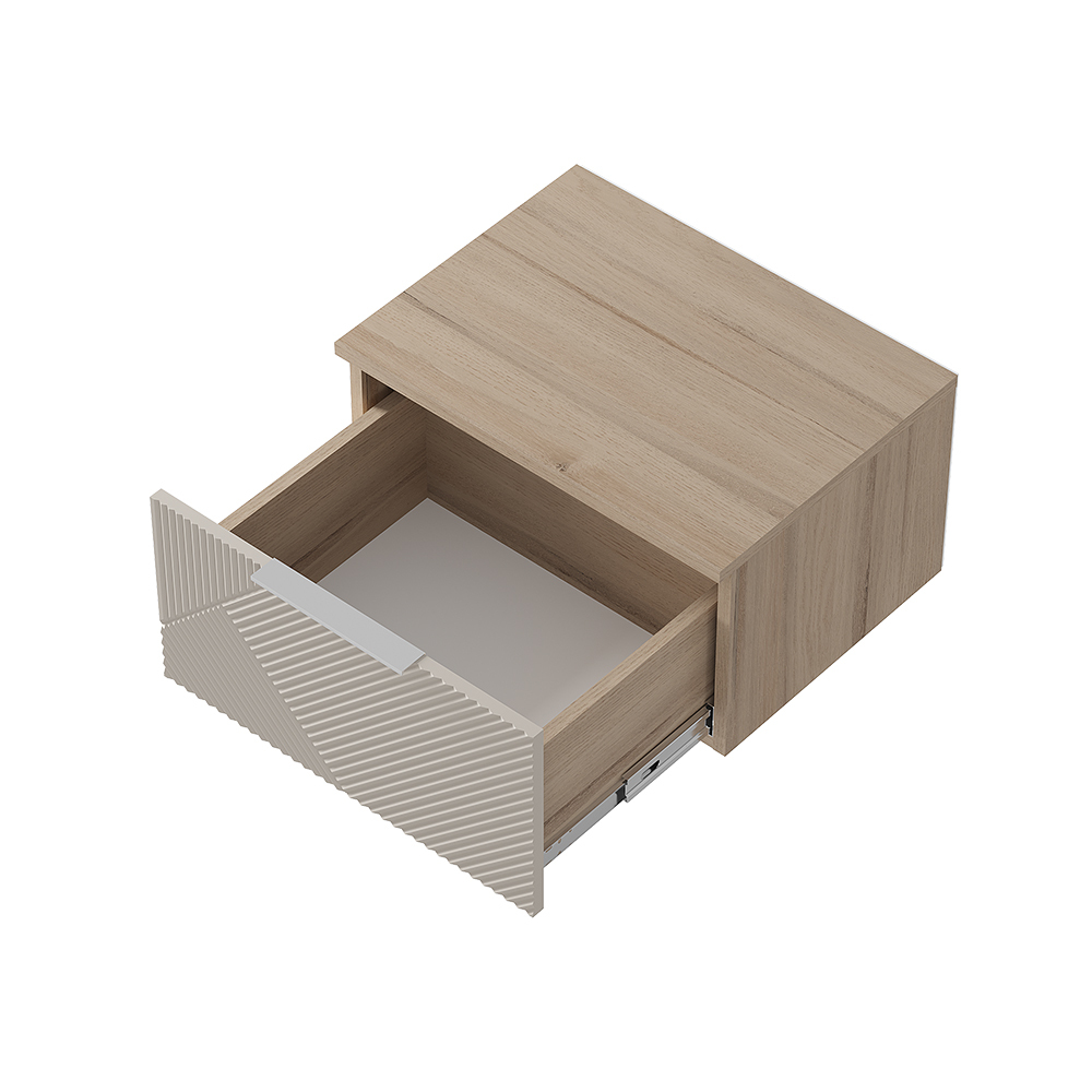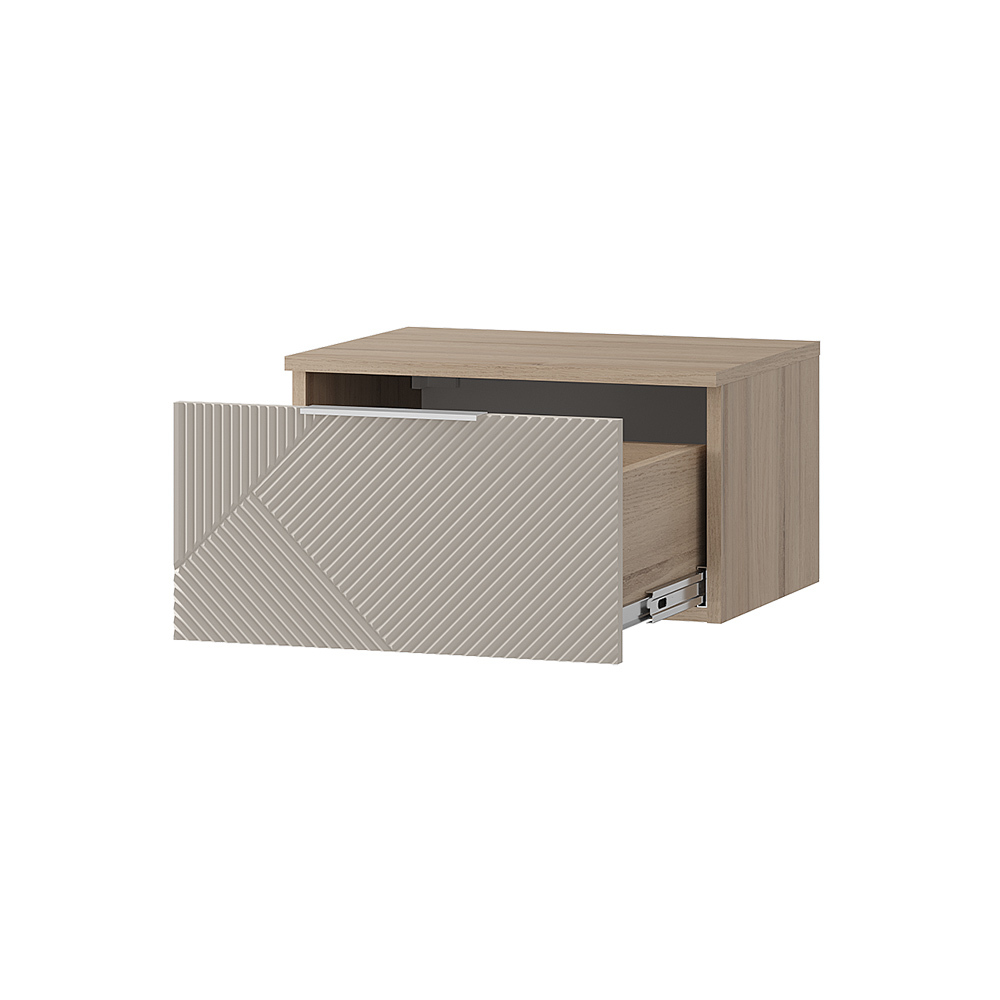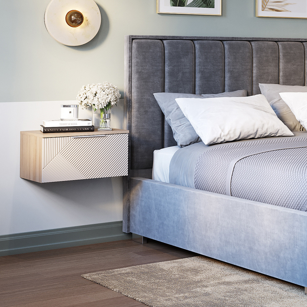 Навесная прикроватная тумба Эмилия позволяет экономить пространство и облегчает уборку пола. Лаконичные модули из данной серии украшены изысканной фрезеровкой, а приглушенная цветовая гамма легко впишется в современный интерьер.