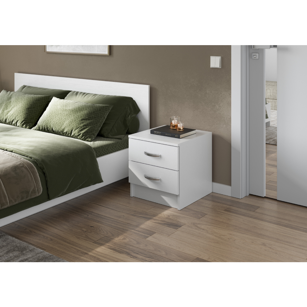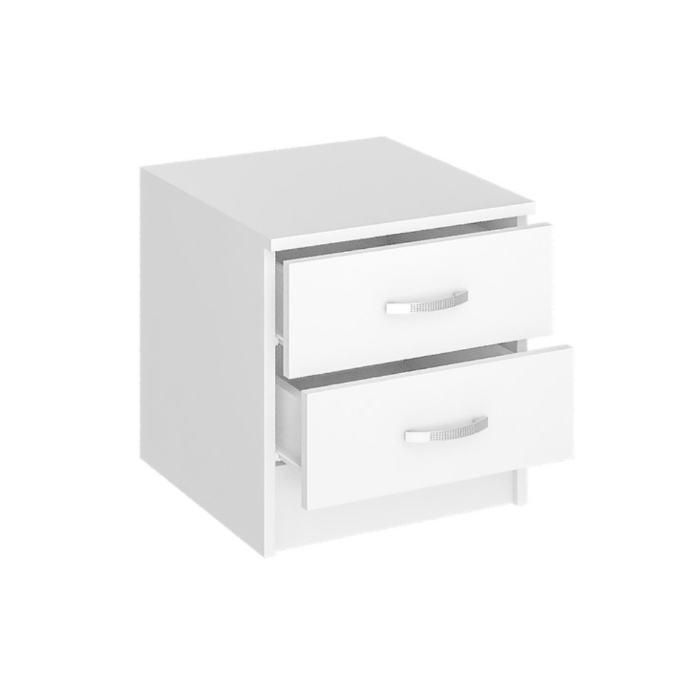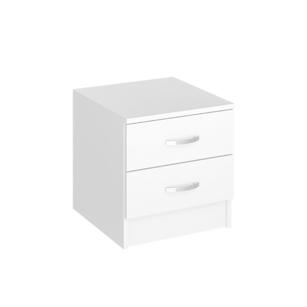 Прикроватная тумба из серии Ронда. Выполнена из ЛДСП в белом цвете. Ящики комплектуются роликовыми направляющими. Ручки пластиковые.