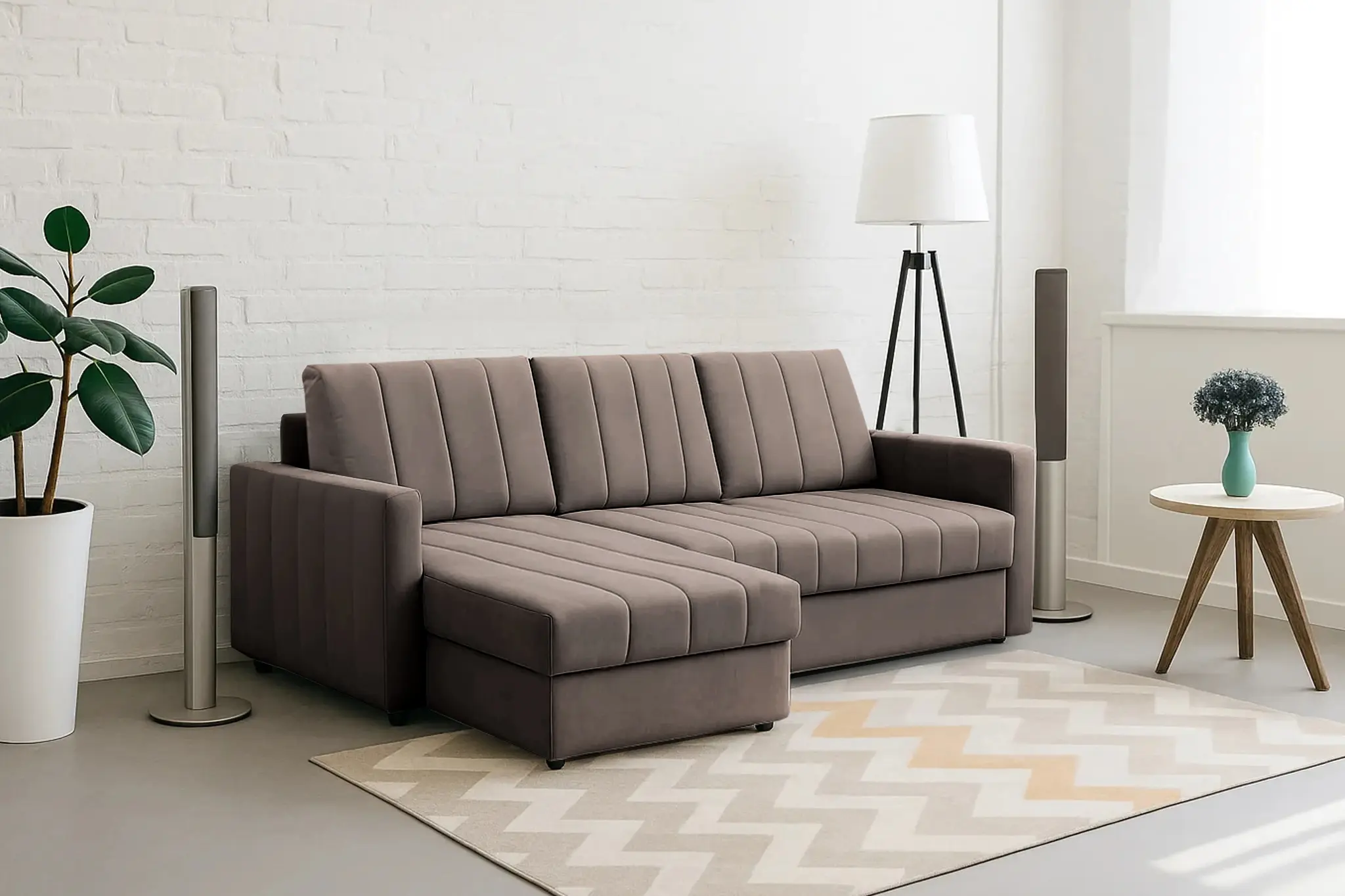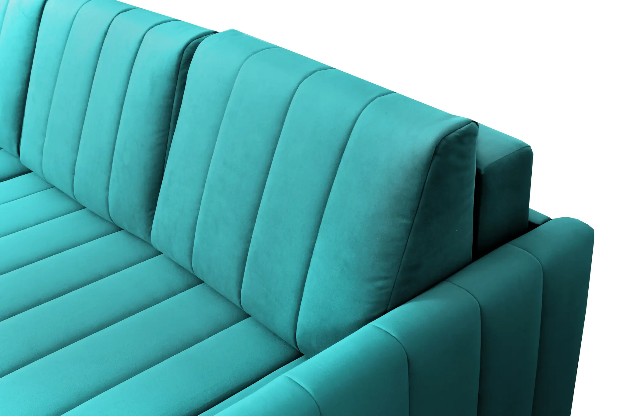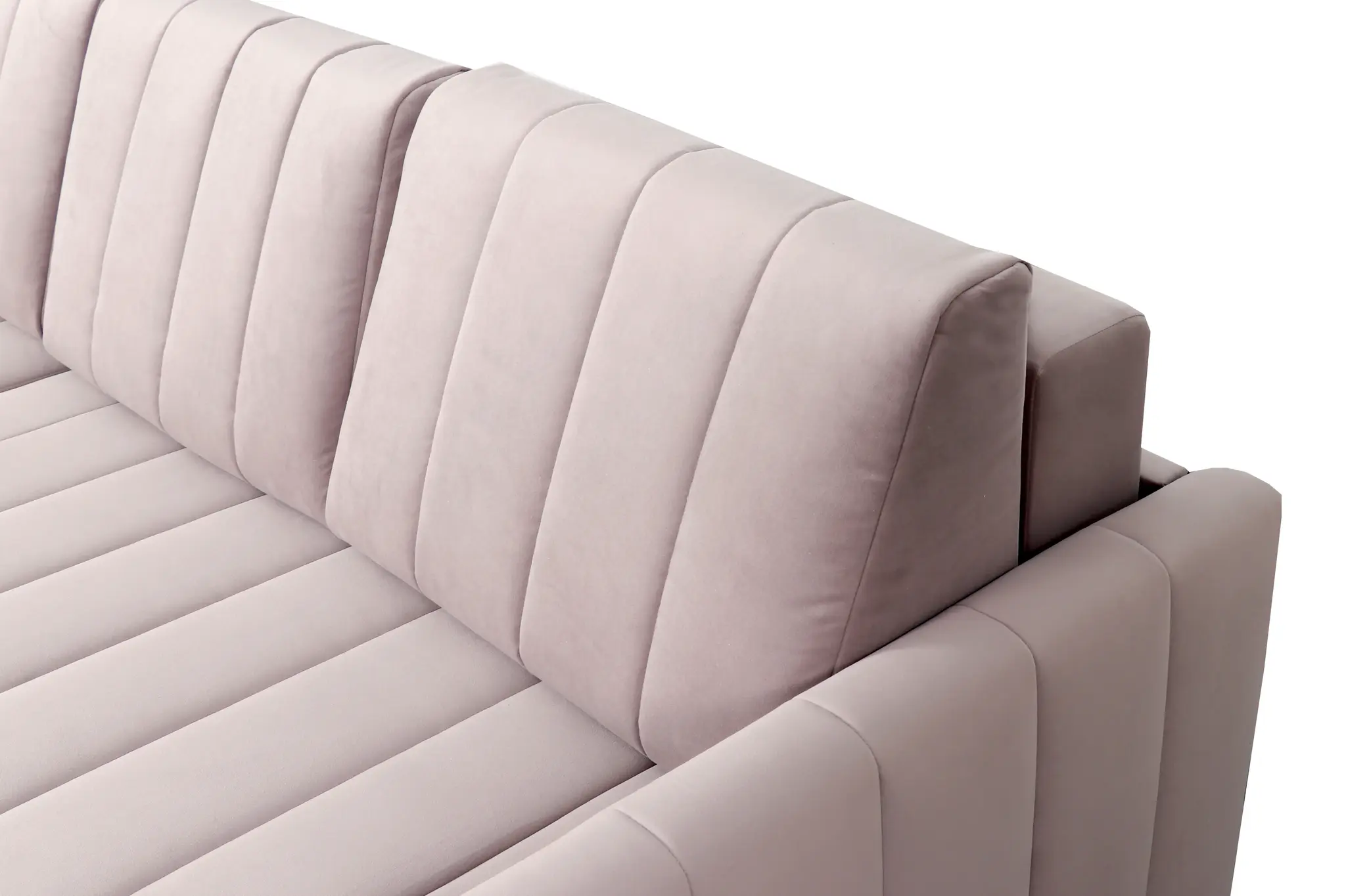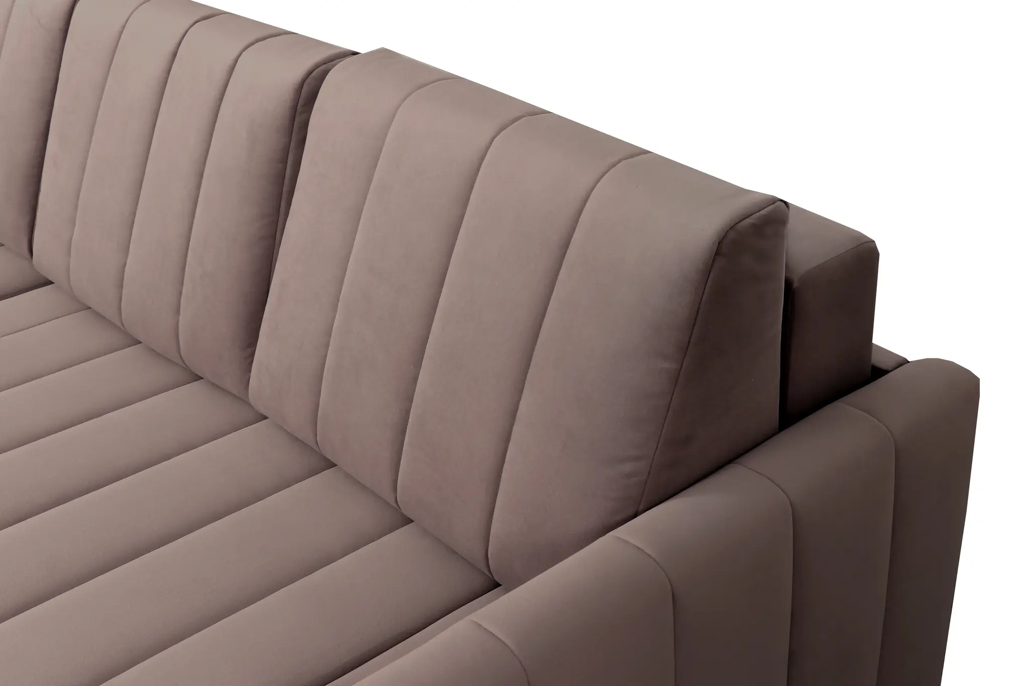 Приспинные подушки, сиденье и подлокотники дивана оформлены модной вертикальной стёжкой в современном стиле.