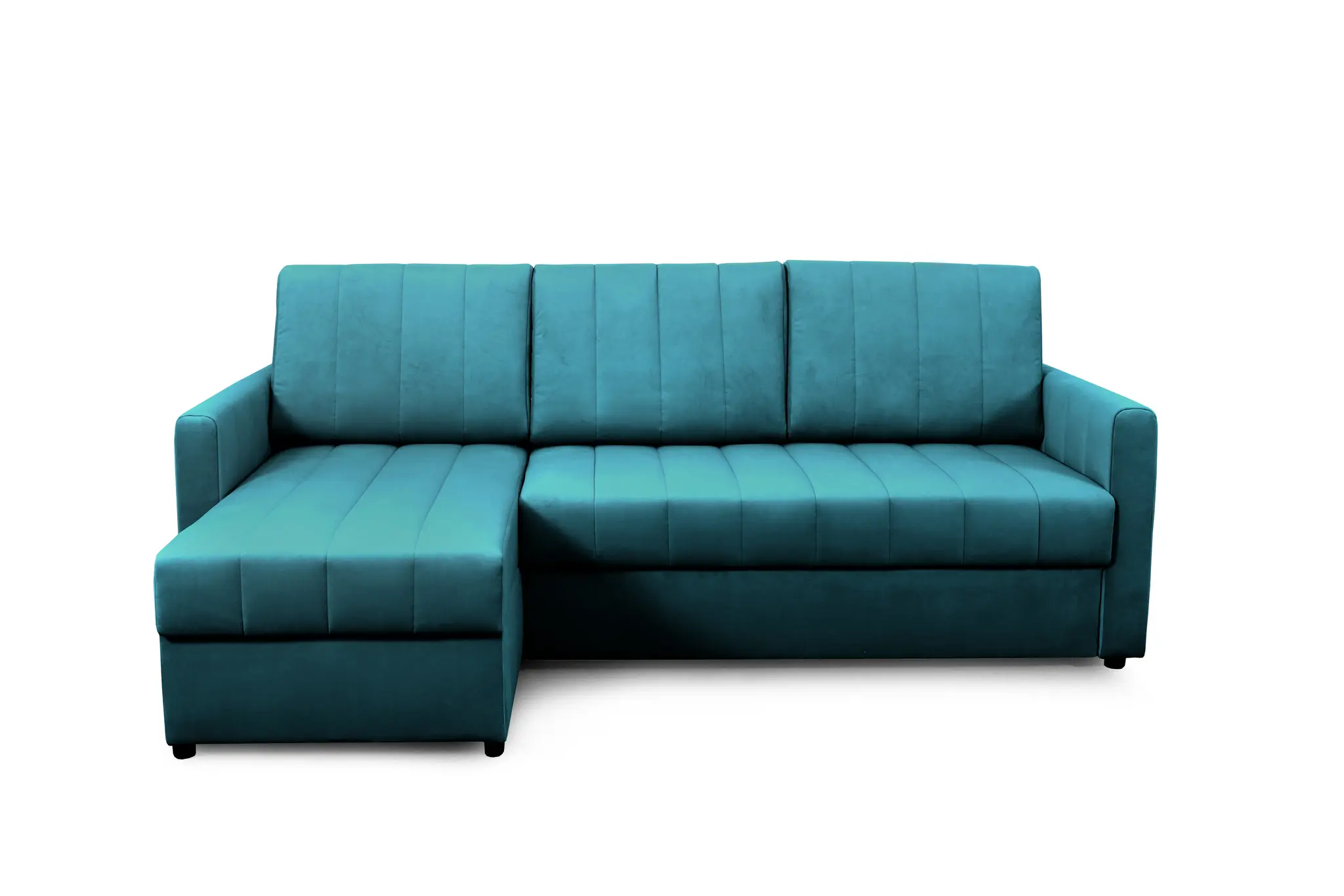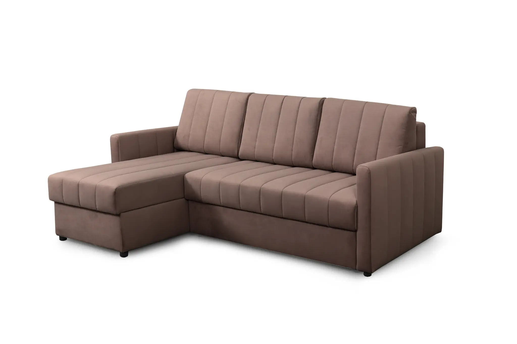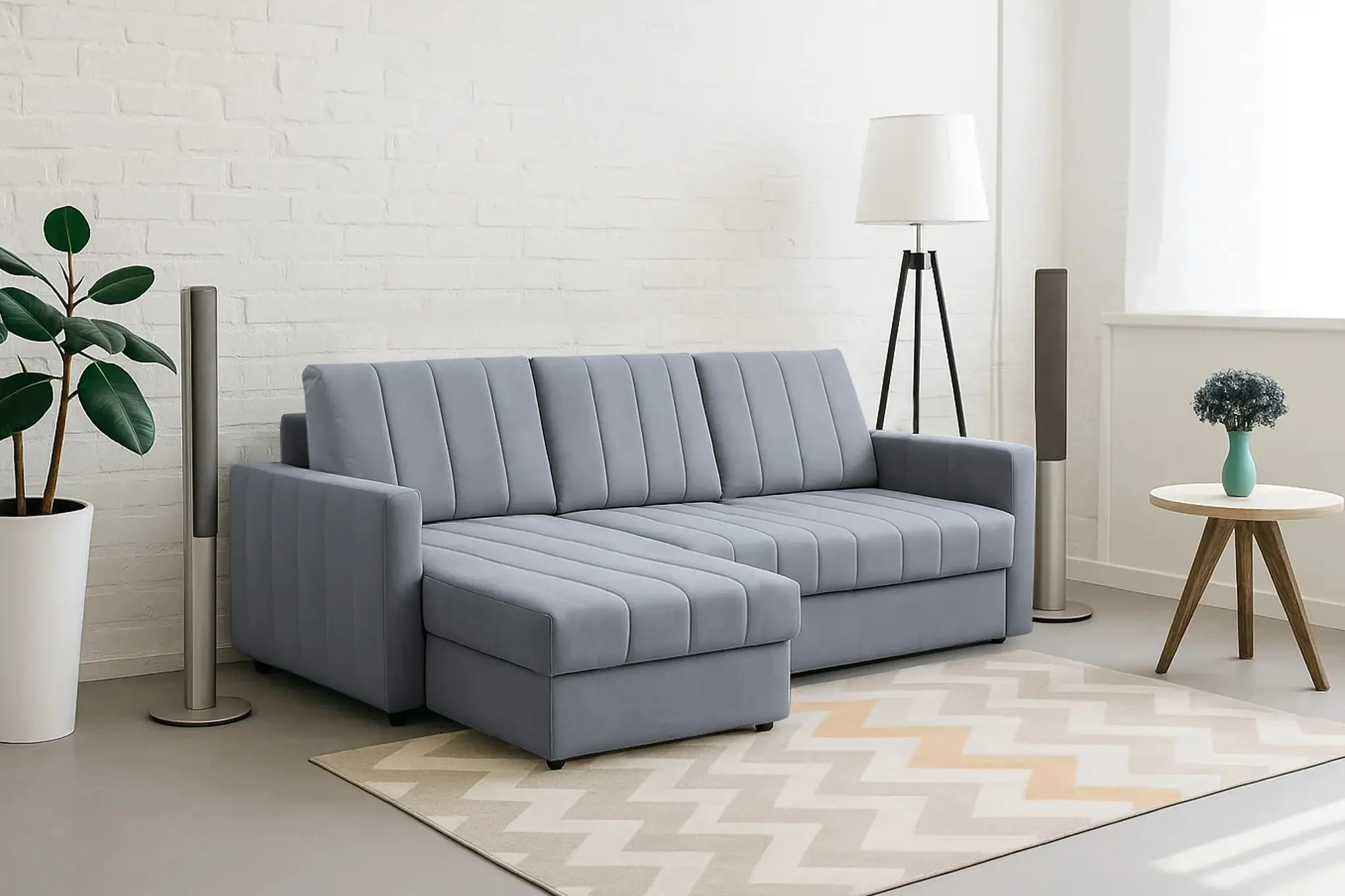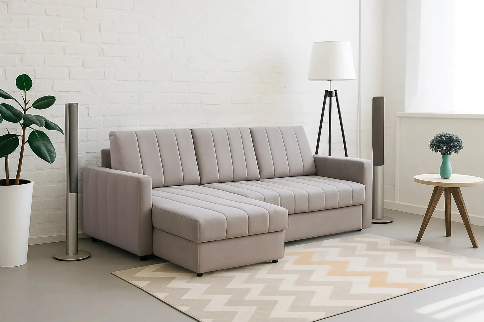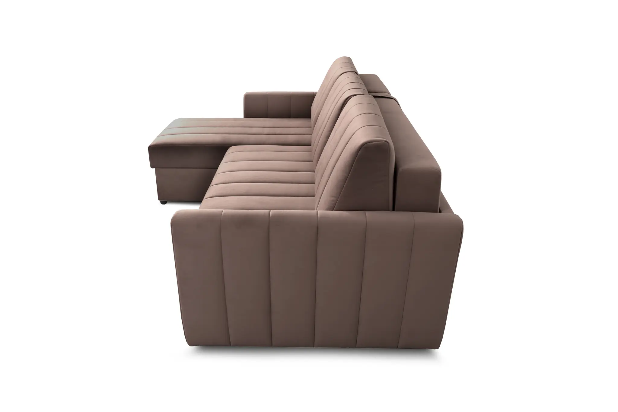 Приспинные подушки, сиденье и подлокотники дивана оформлены модной вертикальной стёжкой в современном стиле.