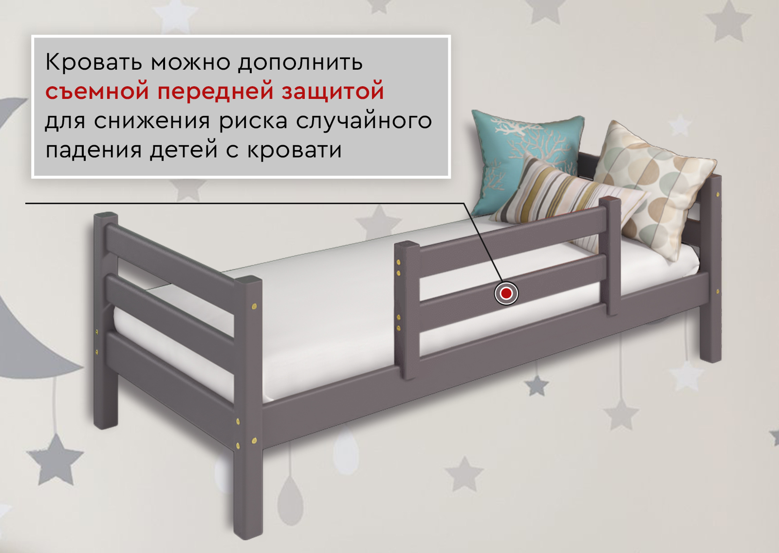 Кровать можно дополнить съемной передней защитой для снижения риска случайного падения детей с кровати. Матрас и выдвижные ящики приобретаются отдельно.