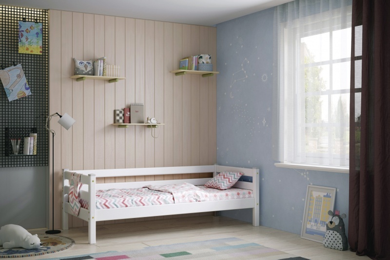 Вариант 2 Кровать «Соня» с задней защитой — один из примеров идеального сочетания практичности, оригинальности и долговечности. Цветовое исполнение подходит сразу для нескольких стилей, а габариты — для комнат разной площади. Мебель для детской создается из безопасных материалов с отличной износостойкостью.