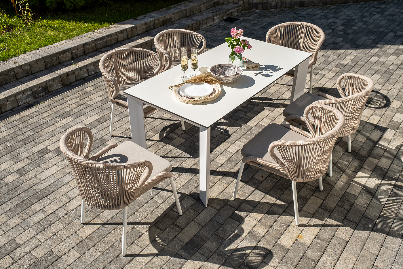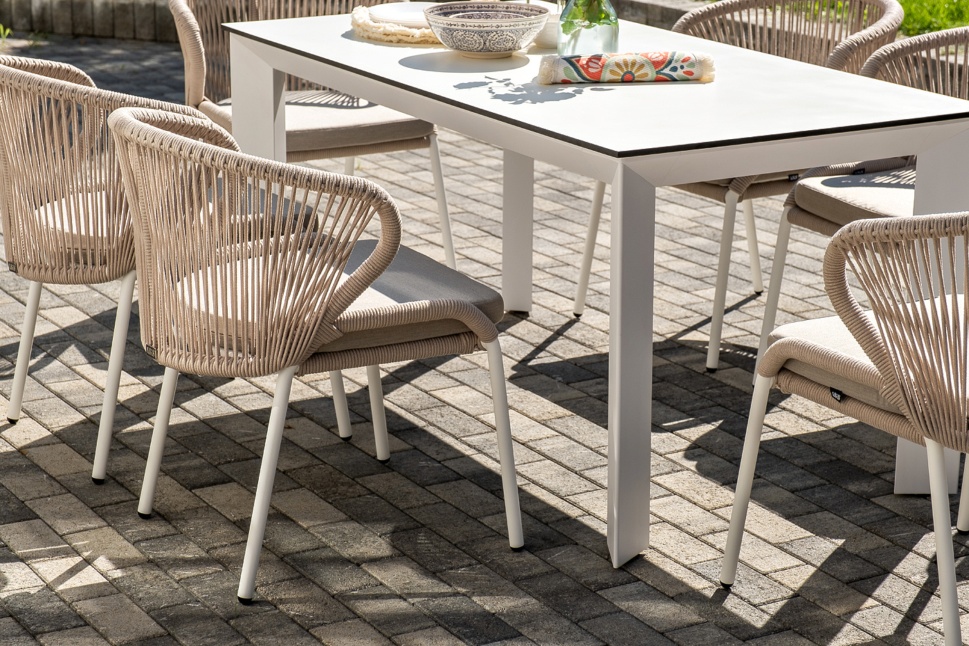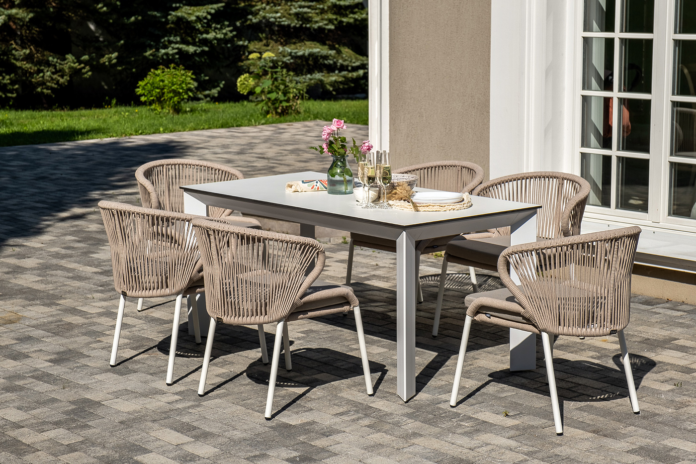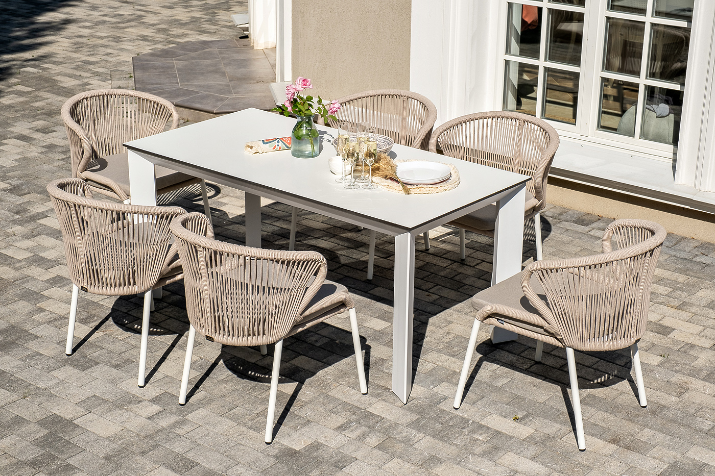 Стол «Венето» оснащен столешницей из надежного HPL-пластика, который обладает высокими показателями стойкости к истиранию, ударам, высоким температурам и влаге, обеспечивая долговечность использования "Венето" обеденный стол из HPL 160х80см, цвет молочный, каркас белый 1шт. 1 600Х800Х750, "Милан" стул плетеный из роупа, каркас алюминий белый муар, роуп бежевый круглый, ткань бежевая 15052 6шт. 600Х660Х810,