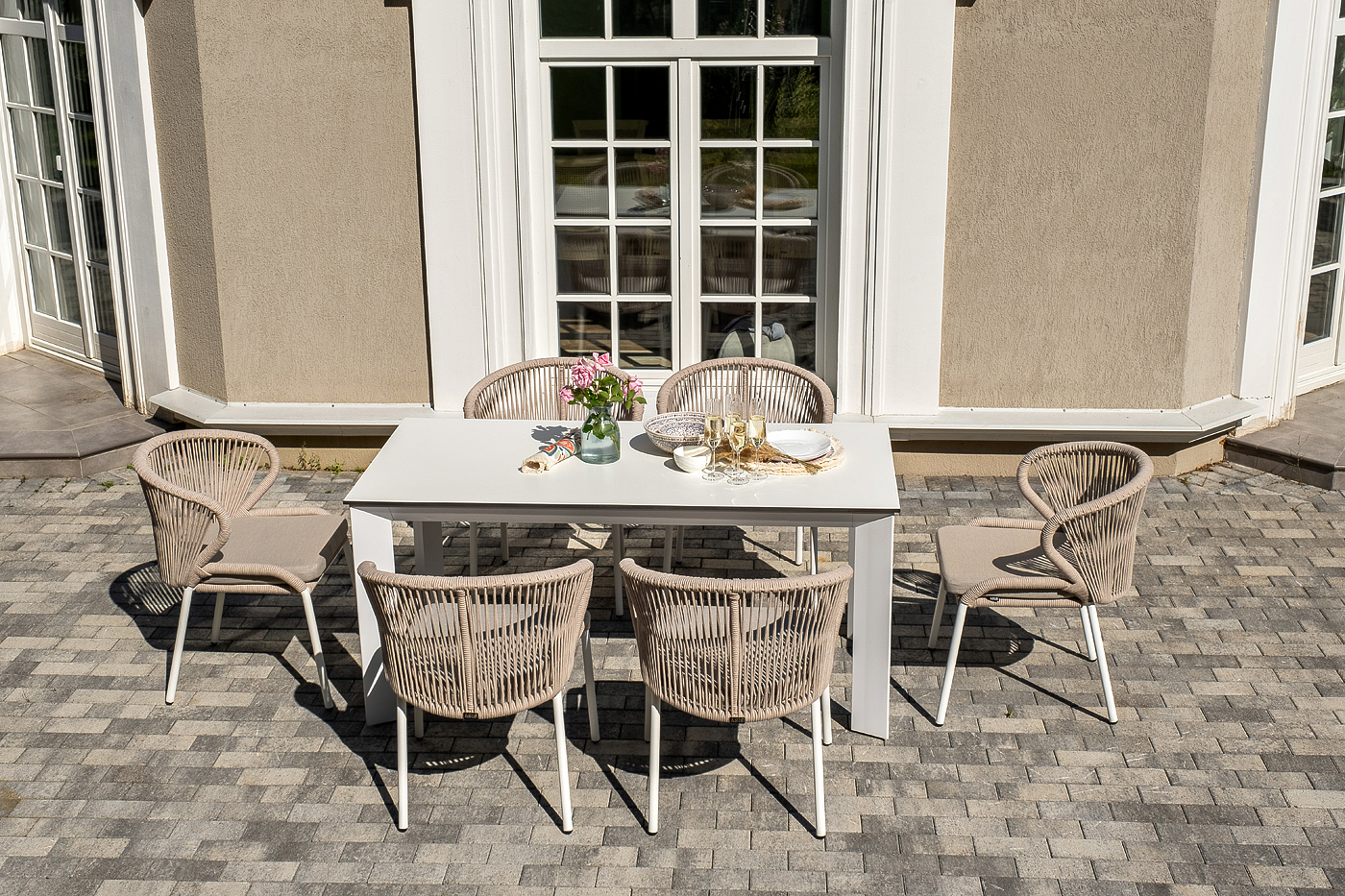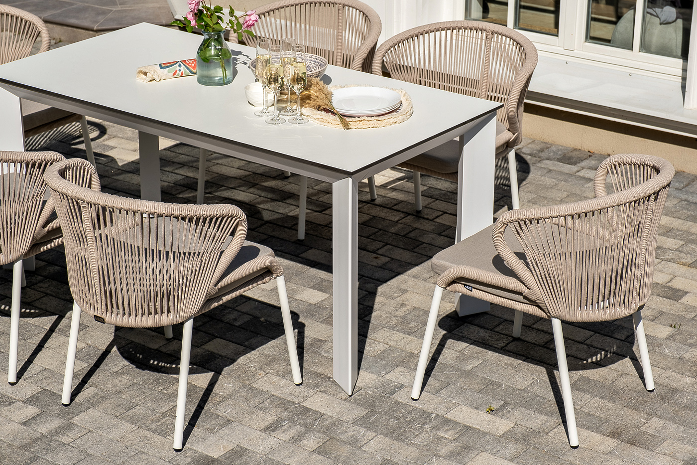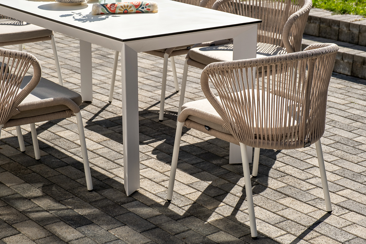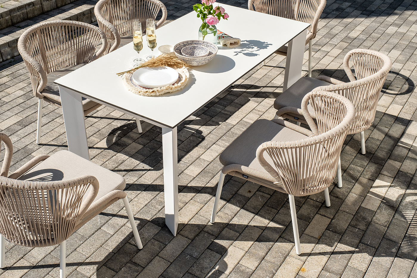 Стол «Венето» оснащен столешницей из надежного HPL-пластика, который обладает высокими показателями стойкости к истиранию, ударам, высоким температурам и влаге, обеспечивая долговечность использования "Венето" обеденный стол из HPL 160х80см, цвет молочный, каркас белый 1шт. 1 600Х800Х750, "Милан" стул плетеный из роупа, каркас алюминий белый муар, роуп бежевый круглый, ткань бежевая 15052 6шт. 600Х660Х810,