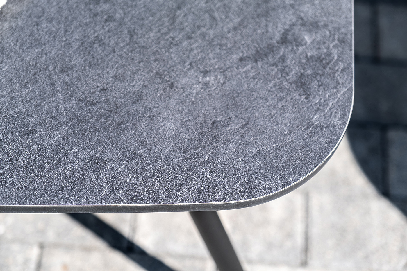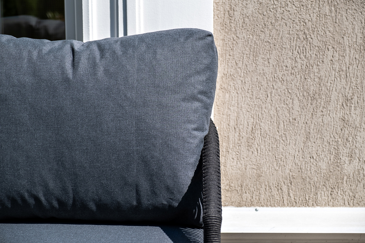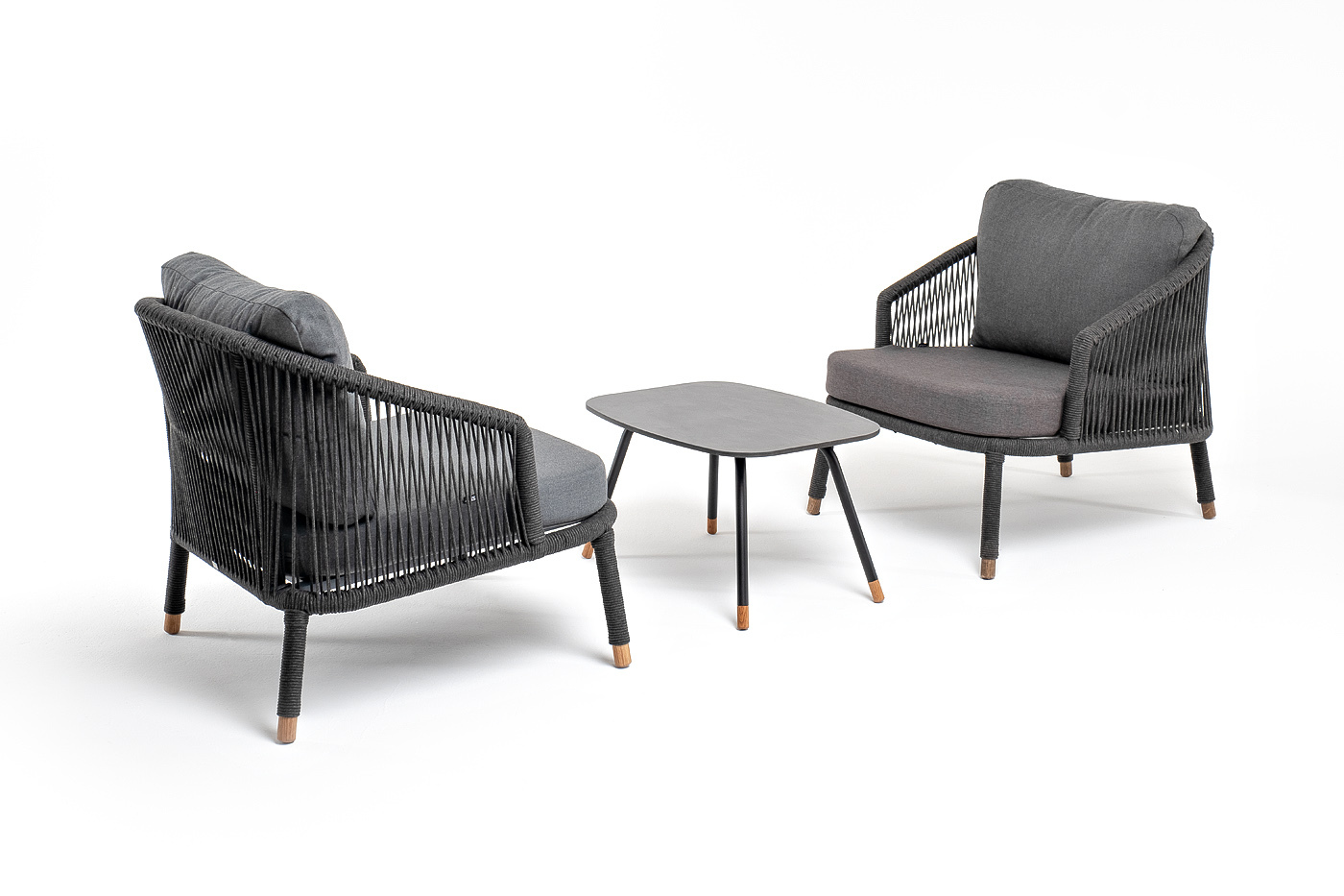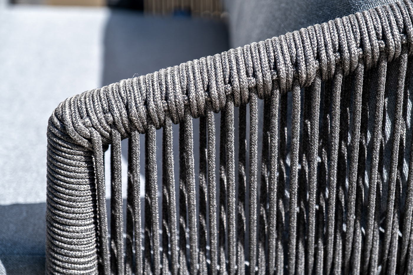 Каркас уличной мебели выполнен из износостойкого алюминия. Его дополняет темно-серая ручная оплетка, изготовленная на основе эластичных синтетических лент из полиэфирных волокон высокой прочности (роупа).