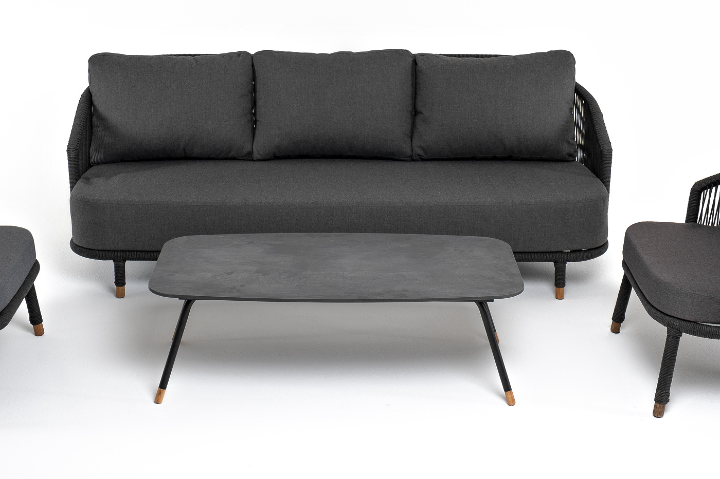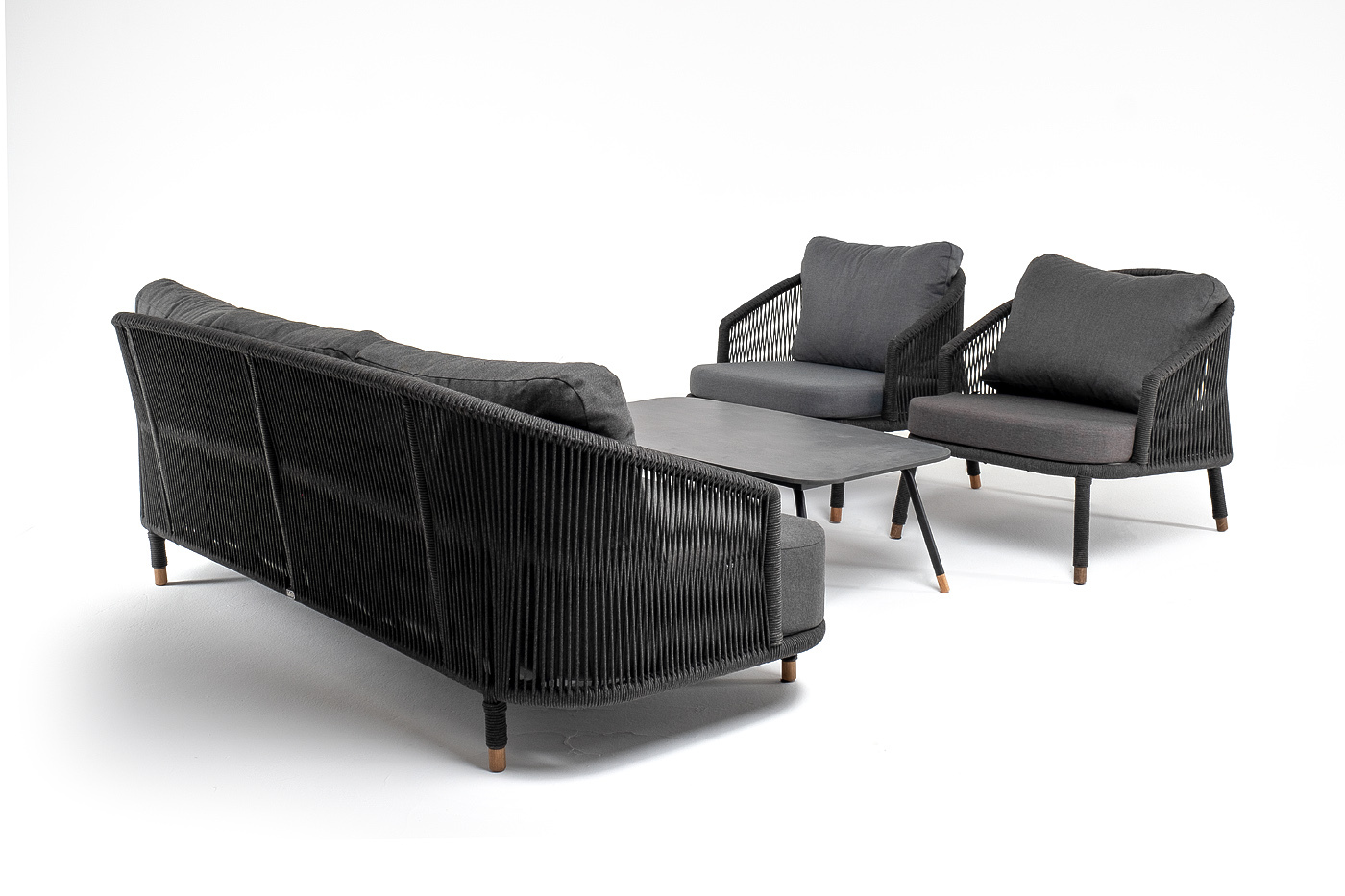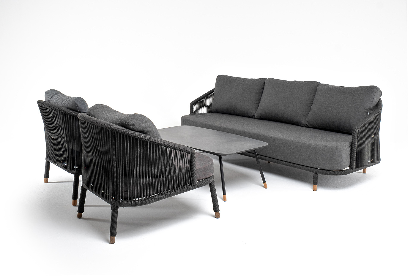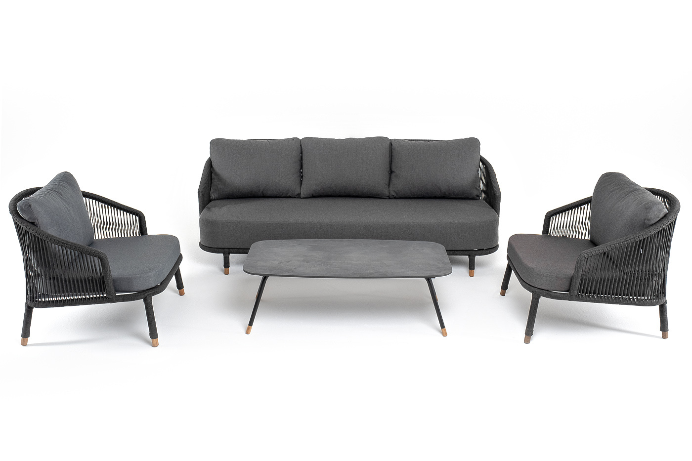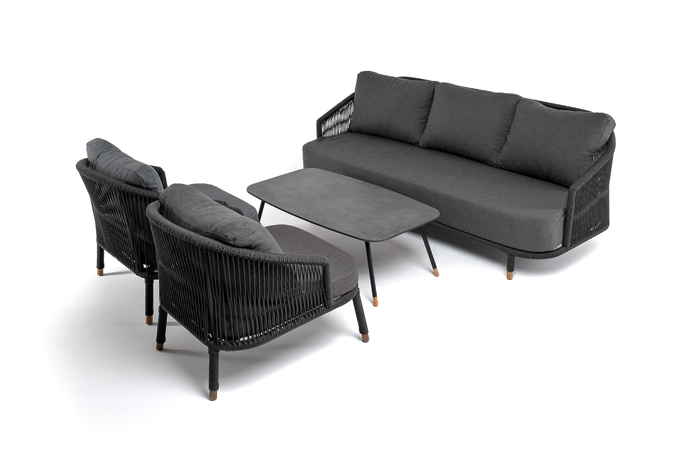 Кресла и диван идут в комплекте с мягкими подушками в чехлах темно-серого цвета. "Верона" диван 3-местный плетеный из роупа, каркас алюминий темно-серый (RAL7024) муар, роуп темно-серый круглый, ткань темно-серая 027 1шт. 2 140Х890Х800, "Верона" кресло плетеное из роупа, каркас алюминий темно-серый (RAL7024) муар, роуп темно-серый круглый, ткань темно-серая 027 2шт. 760Х840Х730, "Верона" журнальный стол из HPL 120х65, H40, каркас черный муар, цвет столешницы "серый гранит" 1шт. 1 200Х650Х400,