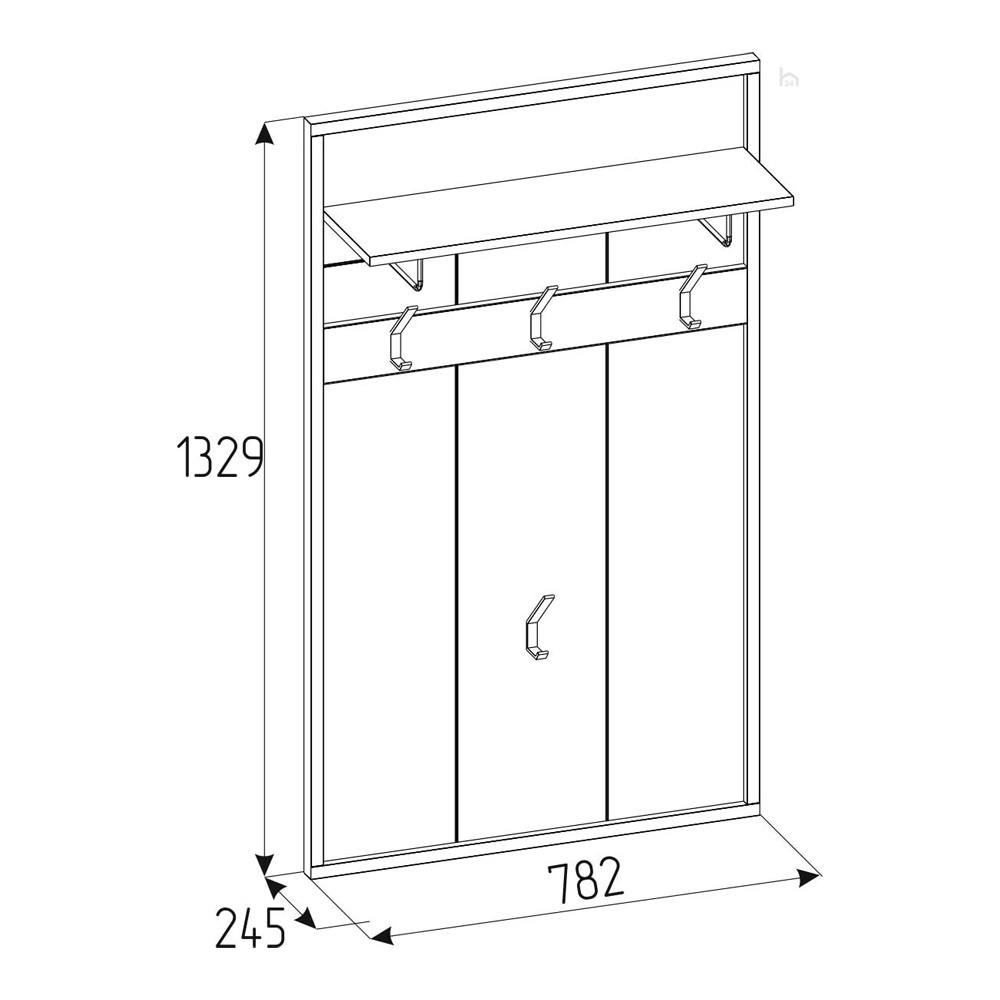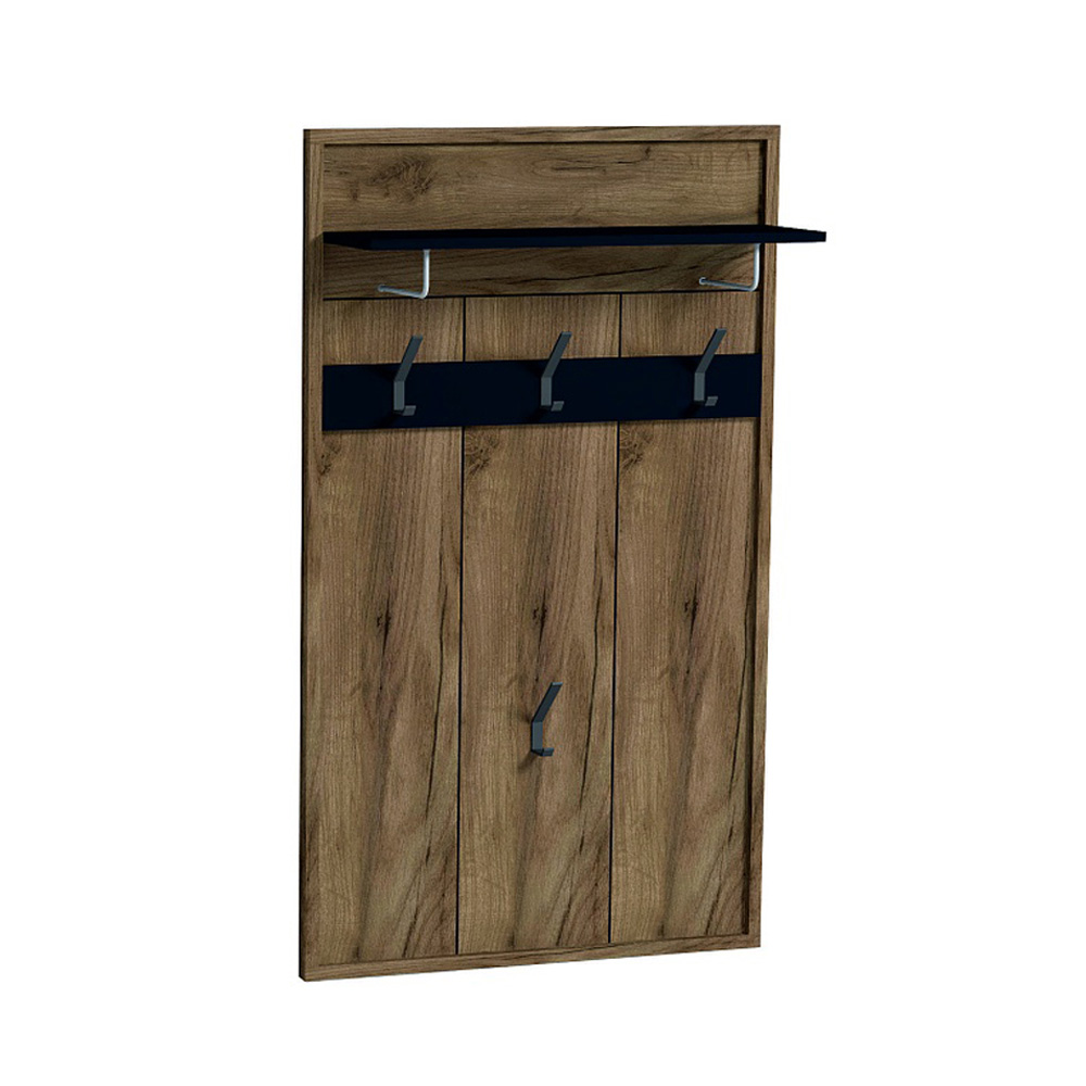 Настенная вешалка поможет использовать пространство прихожей экономно и рационально. Панель оснащена полкой для головных уборов и крючками для верхней одежды и сумок. Верхняя полка глубиной 229 мм крепится с помощью Г-образного полкодержателя. Каждый металлический крючок для одежды выдерживает нагрузку до 5 кг. Детали из черного ЛДСП поддерживают стилистику всей коллекции и подчеркивают выразительность текстуры декора Дуб Табачный с его характерными для благородной древесины крупными трещинами и сучками. Модуль входит в программуШирина ВРАЗМЕР, и это значит, что его ширину можно увеличить или уменьшить на 150 мм с шагом в 1 мм.