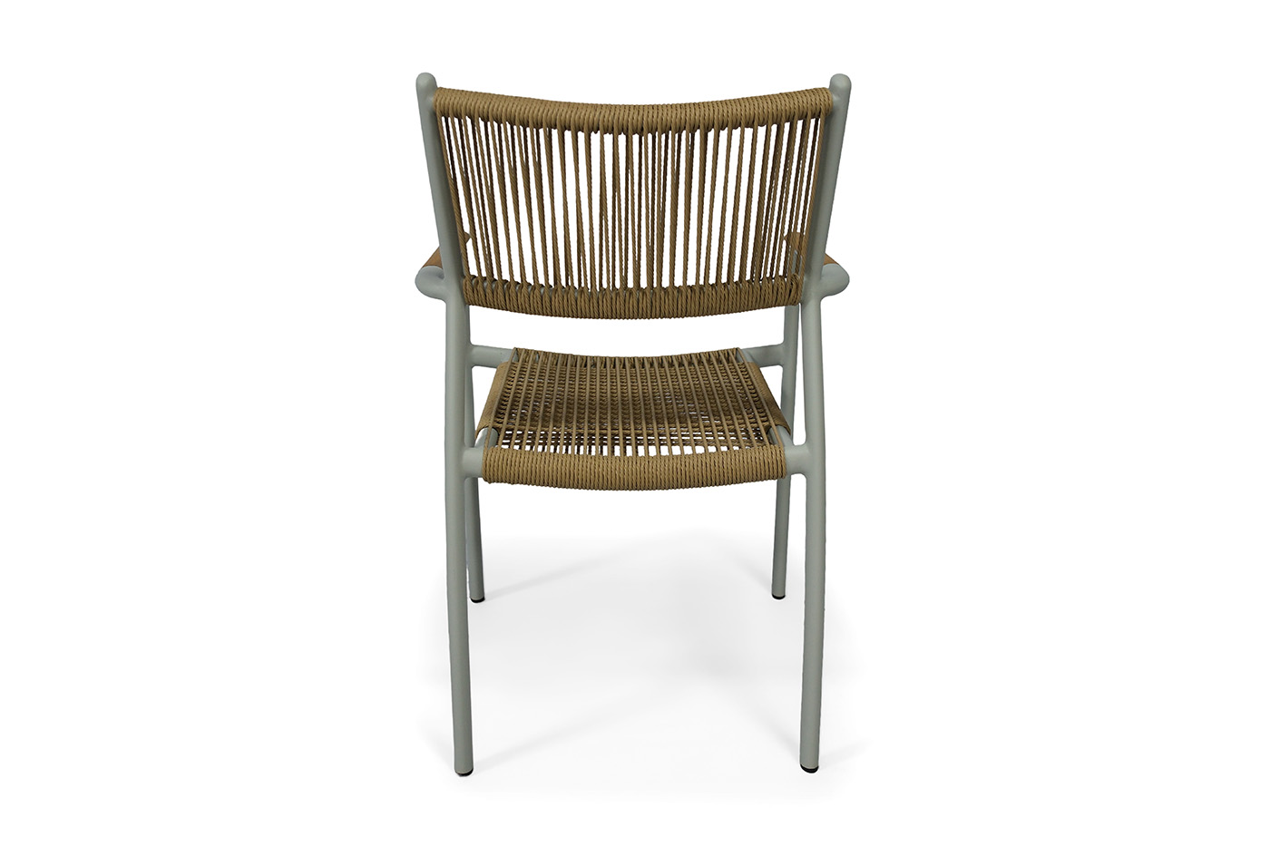 Каркас стула выполнен из легкого, но прочного алюминия, обработанного порошковым покрытием в нежном светло-сером оттенке. Это покрытие не только придает стулу элегантный вид, но и обеспечивает устойчивость к воздействию окружающей среды, делая его идеальным выбором для использования на открытом воздухе.